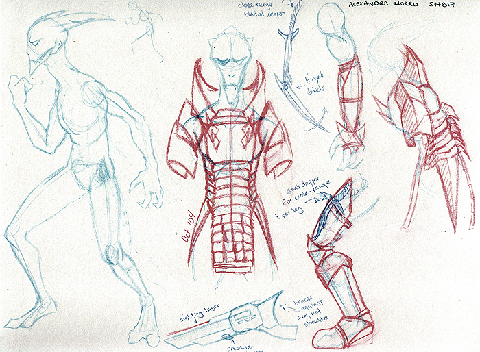 Concepts for an alien warrior, including plate armour and weapons. pencil, 9" x 10" ![]()